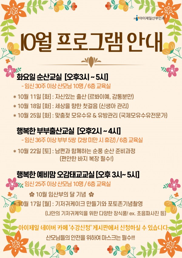 [문화센터] 2022년 10월 산모교실 프로그램 안내 ♥ 작성일 : 2022.09.26 아이제일산부인과 댓글 : 0 조회 : 2,903 2022년 10월 산모교실 프로그램 안내 ♥2022년 10월 산모교실 프로그램 안내 ♥각 프로그램 수강신청은 네이버카페 / 아이제일산부인과회원가입 후 → < 수강신청 > 신청 게시판에서 양식에 맞춰서 신청해주세요