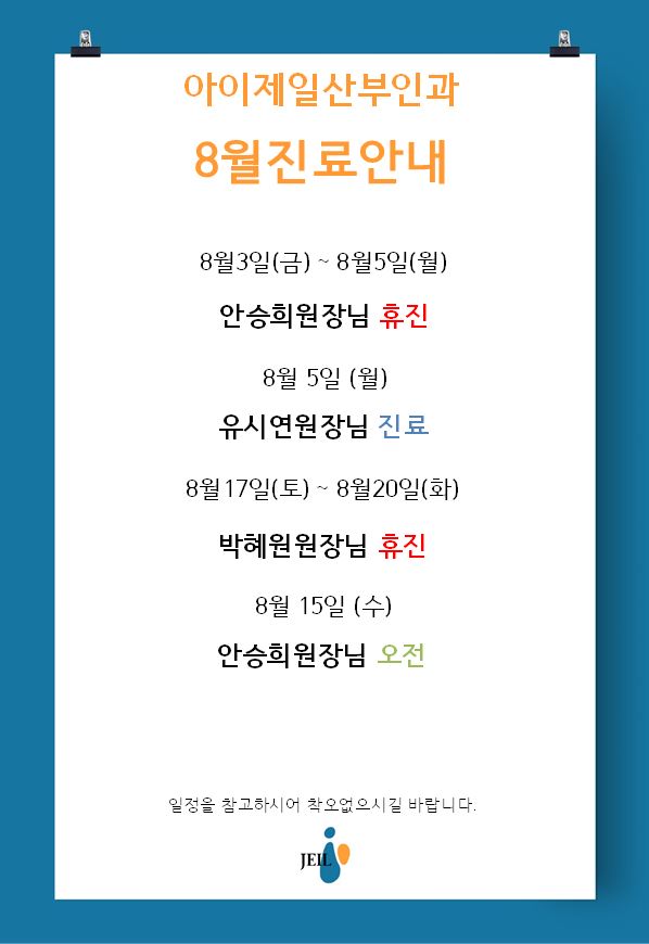 [아이제일소식] <진료> 19년 8월 진료일정을 안내드립니다. 작성일 : 2019.07.17 아이제일산부인과 댓글 : 0 조회 : 8,277 일정을 참고하시어 내원에 착오없으시길 바랍니다. ♥
