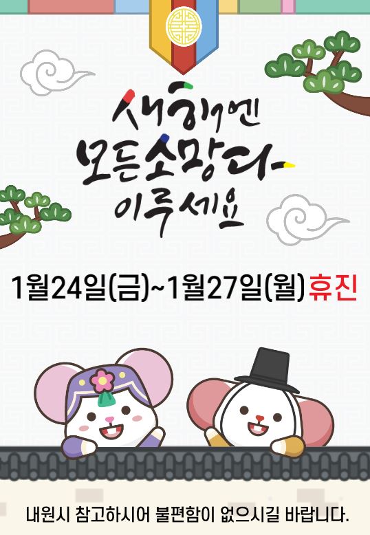 [아이제일소식] <진료> 20년 1월 휴진안내 드립니다. 작성일 : 2020.01.11 아이제일산부인과 댓글 : 0 조회 : 8,556 아이제일 산부인과 설날 휴진안내 드립니다 ♥ 2020.01.24(금) ~ 2020.01.27(월)휴진