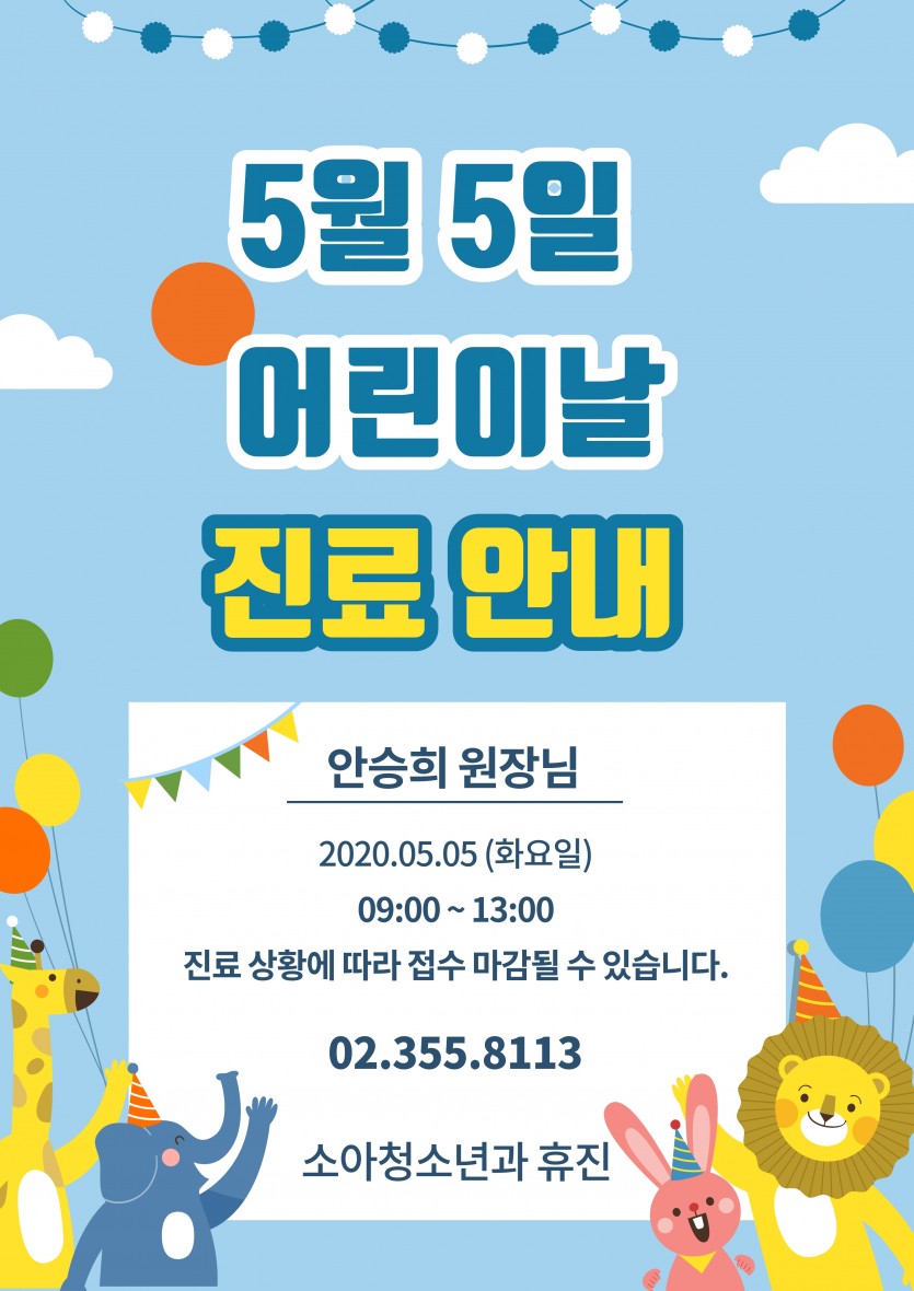 [아이제일소식] <진료> 2020년 05월05일 어린이날(공휴일)진료안내 작성일 : 2020.05.01 아이제일산부인과 댓글 : 0 조회 : 8,110 2020년 05월05일 어린이날(공휴일)진료안내 내용을 참고하셔서 내원시 불편함이 없으시길 바랍니다.병원사정에 따라 변경 될 수 있습니다.