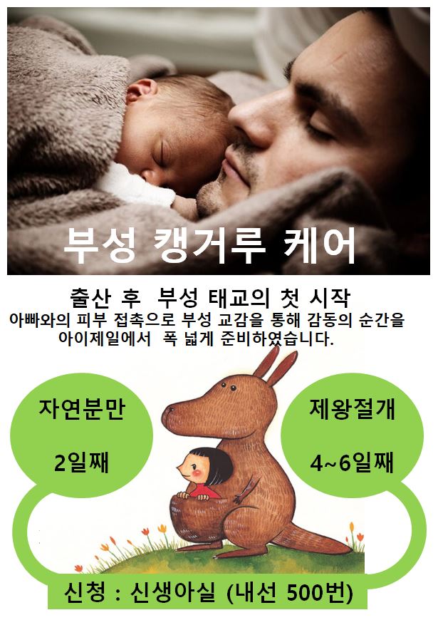 [아이제일소식] [안내] 아이제일 캥거루 케어 안내 드립니다 ^^ 작성일 : 2021.06.24 아이제일산부인과 댓글 : 0 조회 : 6,909 코로나로 인해 면회제한과 조리원 보호자 입실 금지로 인하여 면회시간 연장과 함께 자연분만 하신 산모님들에게도캥거루 케어의 감동과 기쁨을 드리기 위해 폭 넓게 준비하였습니다.신생아실 면회시간 변경 안내1회 1:30~2:302회 7:30~8:30 종전 30분에서 1시간으로 변경되었습니다.