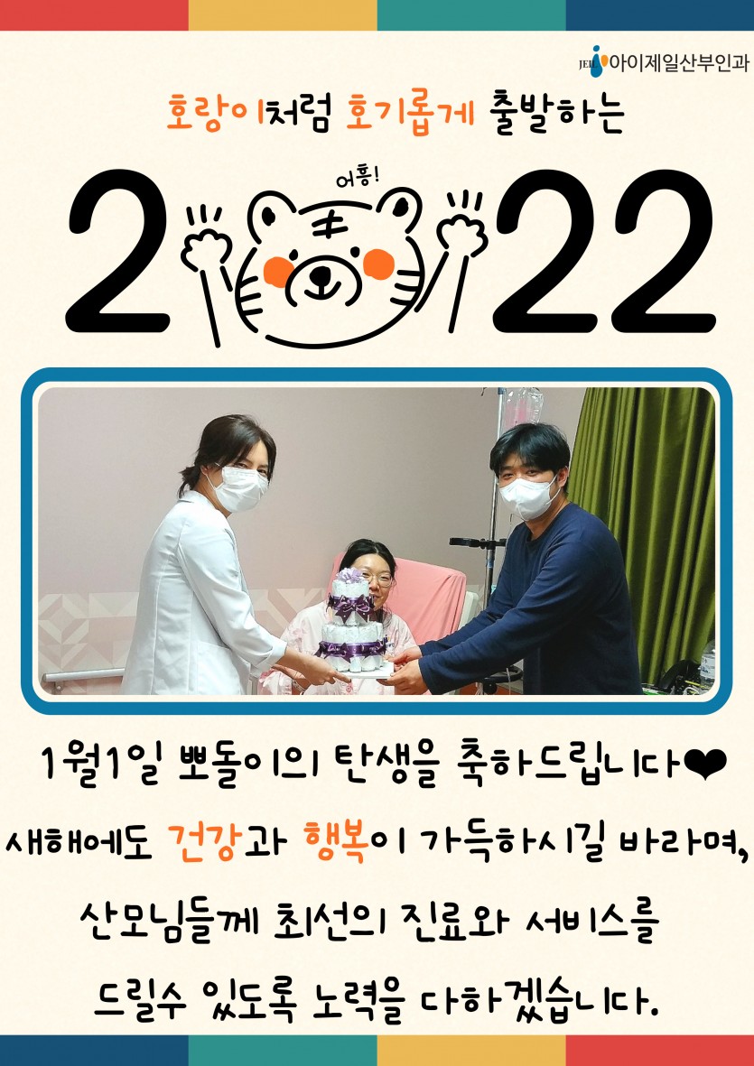 [아이제일소식] [아이제일산부인과] ❀ 2022년 새해 첫 아기 탄생을 축하드립니다 ❀ 작성일 : 2022.01.05 아이제일산부인과 댓글 : 0 조회 : 7,131 2022년 임인년 아이제일산부인과 새해 첫 아기, 새해둥이 탄생을 축하합니다 ❤