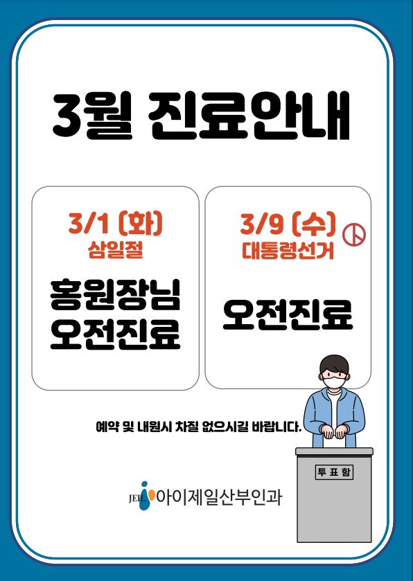 [아이제일소식] 22년 3월 진료안내드립니다. 작성일 : 2022.02.17 아이제일산부인과 댓글 : 0 조회 : 6,946 22년 3월 진료안내드립니다.3월 1일 화요일홍성훈원장님 오전진료3월9일 수요일홍성훈 원장님, 안승희원장님, 한상확 원장님 오전진료*24시간 분만 / 응급진료*※ 소아과 진료안내 매주 수요일,공휴일 휴진 / 토요일 오전진료 ※위 내용을 참고하셔서 내원시 불편함이 없으시길 바랍니다.병원 사정에 따라 변경 될 수 있습니다.