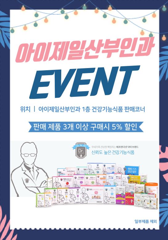 [아이제일소식] [안내] 아이제일 & 에프앤디넷 이벤트 작성일 : 2019.06.29 아이제일산부인과 댓글 : 0 조회 : 8,449 아이제일산부인과 1층 산부인과 내 에프앤디넷이 입점되어 있습니다 ♥제품 3개 이상 구입시 5% 할인!! / 일부제품제외많은 관심과 사랑 부탁드립니다 :)